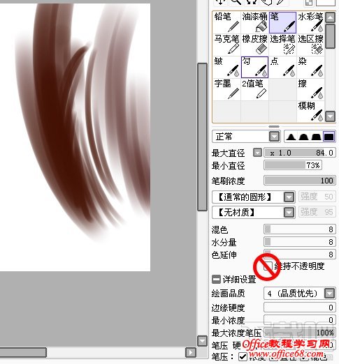 图7 8.现在选择“笔”工具,在“详细设置”中勾选“浓度”“直径”“混色”,将最小浓度调整到最小,最小直径调大,混色的值稍微设置一点。 这个就是我们接下来用于上色的笔。不要勾选“保持不透明度”。否则轻压力的淡颜色会覆盖原 有的颜色。