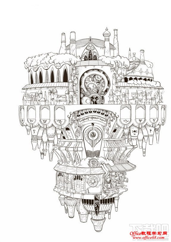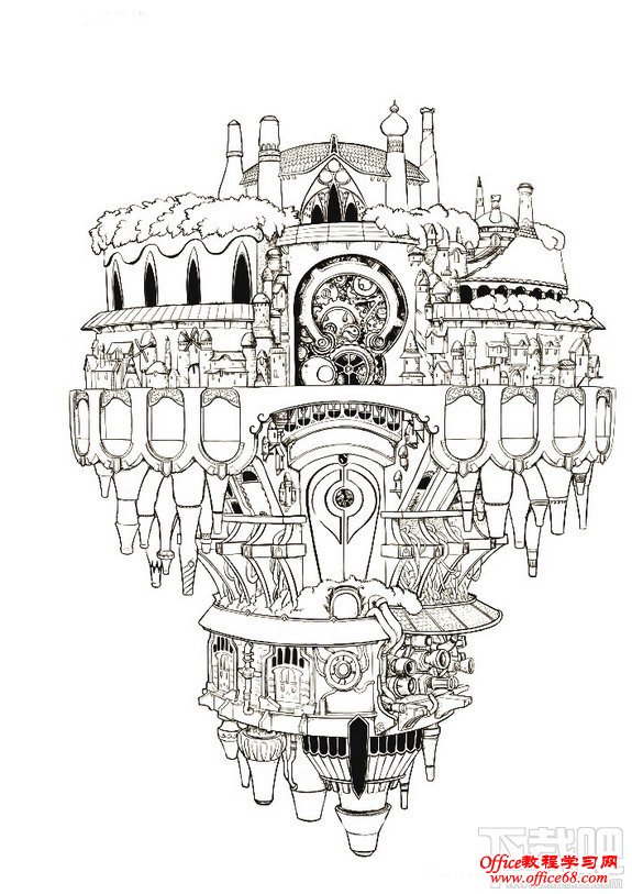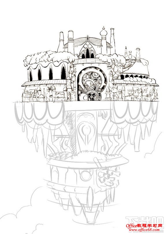 图1 2.新建图层,还是选择传统的没有任何纹理效果的铅笔勾线。 这个时候推荐使用一些颜色,不要用全黑,因为如果有颜色信息的话回头可以调整颜色。我的习惯是画多少,就把下面图层的草稿擦掉。在绘画的过程中可以不断地把自己的想法 加入。这张图的右边城堡我就改变了草图的想法。