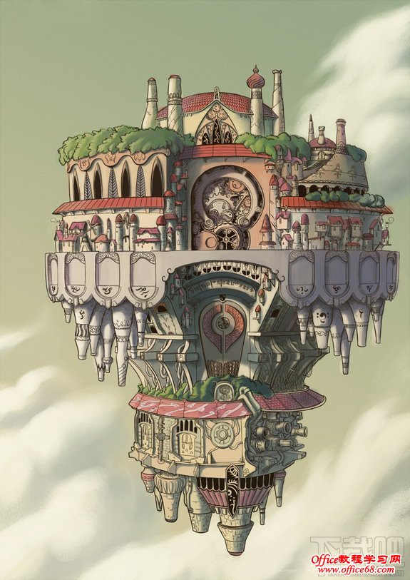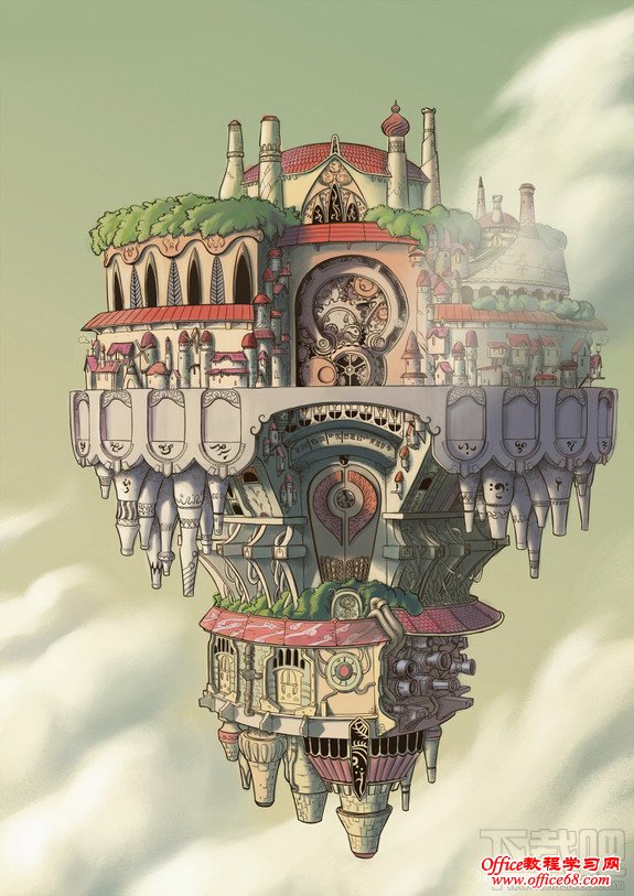 图13 14.回到画面本身,在前面加上云雾,强调了空间感,同时把其他的云彩亮部提亮一点,再将底部觉得单调的颜色稍做修改,这张画就可以完工了。