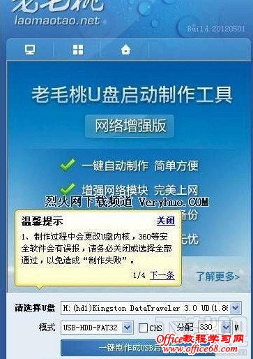 3: 在点击“一键制成USB启动盘”按钮前,一定要注意备份U盘里的重要数据。虽然U盘资料可以恢复,可有些都被损坏了。