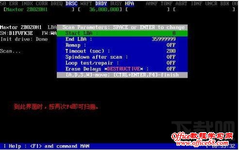 4、进入扫描硬盘的操作,这里有很多选择。一般都是执行运行SCAN命令。其实我个人也不是很懂怎么执行,反正快捷键是F4,但是一定要按两次F4,按一次是不行的。按两次之后就开始扫描所选择的硬盘了。