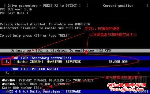 3、一般不用管他就会自动进入到以下图所示的界面,而且就会自动扫描到当前主板上挂载的东西,如果有硬盘、光驱、U盘的话,就会显示出来序号、型号和容量。这里只挂载了一个硬盘,所以就只显示一个硬盘。输入序号3,然后回车确定。说明一下这个3就是MHDD硬盘检测工具检测到的硬盘序列号。