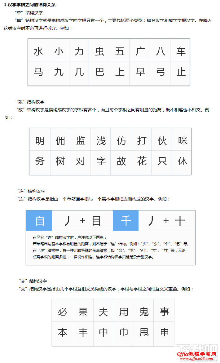 金山软件公司发布的金山打字通正式版,金山打字通界面清新简洁友好,用户能在较短的时间内掌握软件的使用。金山打字通具有比较强大的打字练习功能,能满足用户的需要。我们来学学金山打字通2013里五笔拆字原则。 1:汉字字根之间的结构关系 ![]() 2:汉字的拆分原则