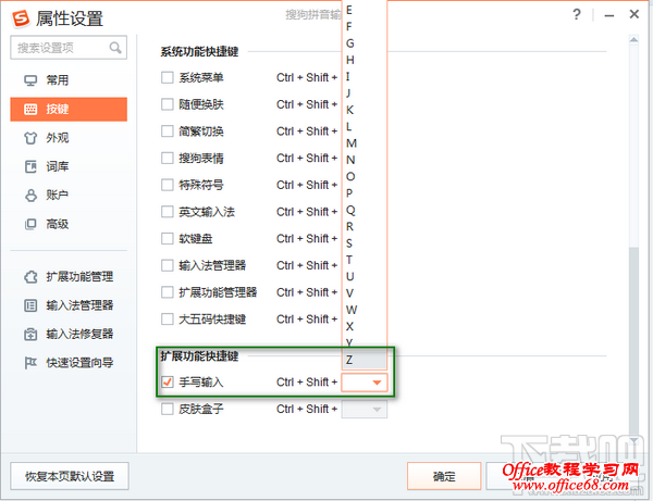 3.点击左侧的“按键”,拖动右侧的滚动条到底部,勾选“手写输入”,点击小三角选择一个字母键(只要不与其他快捷键冲突即可),小编偷懒选择了最近的Z。
