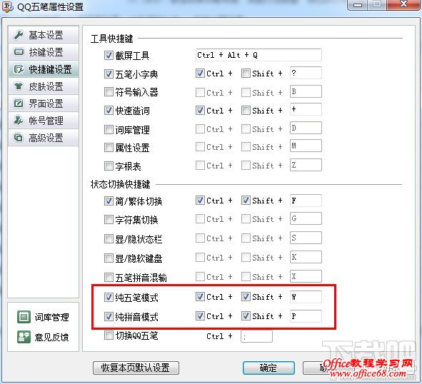 2、进入到快捷键设置,有个“状态切换快捷键”,下面可以设定QQ五笔输入法的纯拼音模式和纯五笔模式的快捷键。我们勾选一下,然后自己设置键位就可以了,例如:小编纯拼音模式设置为“Ctrl+Shift+P”,而纯五笔模式设置为“Ctrl+Shift+W”。