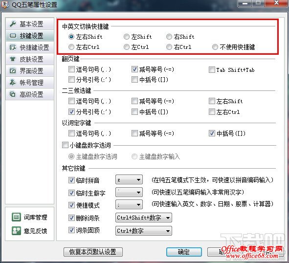 2、进入到快捷键设置,有个“中英文切换快捷键”,下面可以设定QQ五笔输入法的中英文切换快捷键。我们选一下自己喜欢的就可以了,然后点击保存即可。