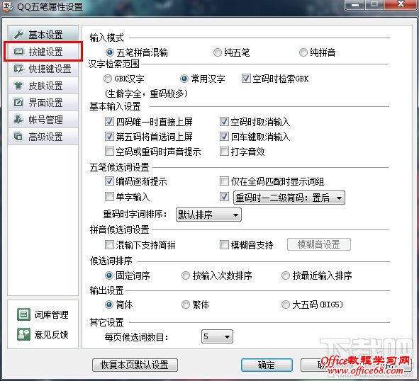 1、首先打开QQ五笔输入法的设置,然后在左边找到“按键设置”,点击。