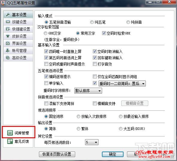1、首先打开QQ五笔输入法的设置,然后在左边找到“词库管理”,点击。