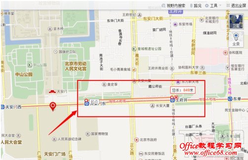 4:如果两个地方之间的距离很近,打车的话很没有必要,步行会需要一点时间,如果我们想要知道确切的距离,可以使用测距功能。点击“工具”按钮,下拉菜单中选择“测距”。
