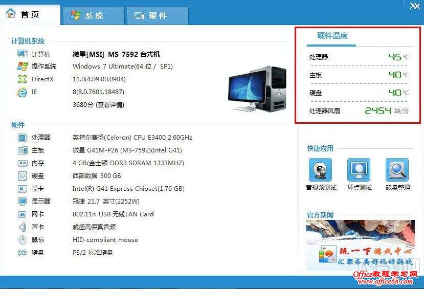 接下来就会弹出一个你的硬件配置显示信息,最右边就是你的硬件温度。硬件温度过高的童鞋就赶紧给电脑降降温吧。
