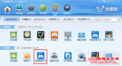无线路由器的缺点在于WiFi密码易被破解,被人家蹭网。每当你觉得网速越来越慢的时候,你是否知道此刻你的网络正在被别人蹭网呢?除非你是专业的,否则一般用户肯定不知道。金山旗下新毒霸路由管理大师来了,轻松检测无线路由器安全,并可检测是否有人蹭网。下面就随小编来看看金山新毒霸路由管理大师怎么用吧. 金山毒霸路由管理大师怎么开启下载并安装金山毒霸路由管理大师,在金山毒霸主界面点击【百宝箱】,在热门应用或新毒霸下点击即可开启。