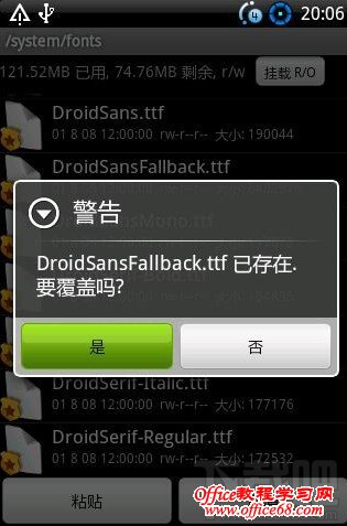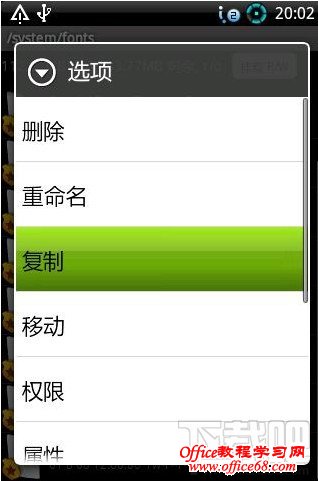 2:以防你替换的字体显示不全或手上没合适的其他字体文件更换,用RE管理器先把他复制到SD卡根目录备份!如图(按住字体文件,弹出对话框选复制,退回到/sdcard,先别选择粘贴。。看到右上角有个挂载读/写。。点一下。。选择成读写状态挂载R/O。。选择粘贴!