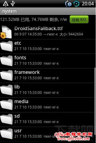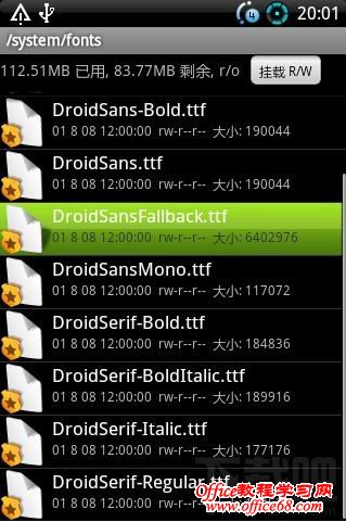 1:手机得先ROOT。。安装RE文件管理。修改字体前,让我们先了解下android系统字体。打开RE管理器,进入/system/fonts,如图里面的就是所有的字体文件。基本系统字体结构:DroidSans.ttf-默认英文字体,DroidSans-Bold.ttf英文粗字体。。.。。其他别管,要替换的是这个:DroidSansFallback.ttf系统默认中文字体