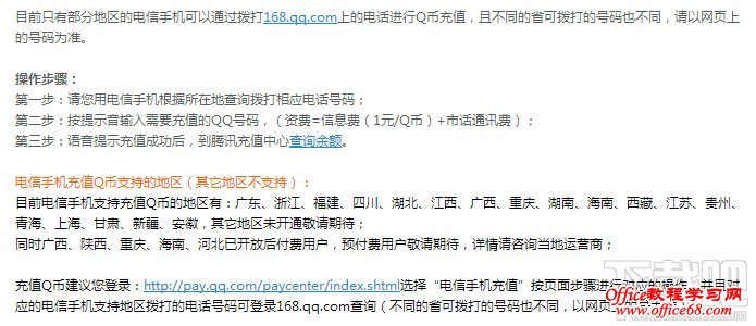 目前只有部分地区的电信手机可以通过拨打168.qq.com上的电话进行Q币充值,且不同的省可拨打的号码也不同,请以网页上的号码为准。