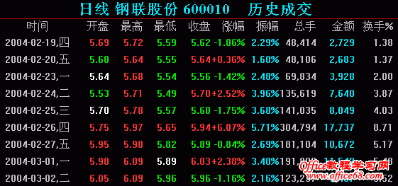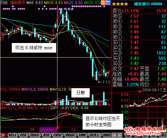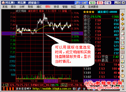 您可以用“同花顺”方便地查看历史上的分时走势。只要在K线图上的某根K线上双击鼠标或者将光标移到某根K线上按“enter”键,右下角的分时走势窗口就会显示相应的那一天的分时走势。在分时走势窗口双击鼠标,还可以将该窗口发大,便于您详细查看。在放大之后的分时走势窗口双击鼠标,则恢复成原来的样子。