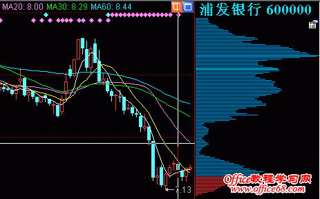 彩色的成本分布线,显示套牢盘和获利盘,显示成本集中度,直观显示当日新增成本。图中右半部分柱状图的长短反应了光标停留的那一天,分布在各个价位筹码的多少。红色表示获利的筹码,蓝色表示套牢的筹码。具体的说明参见“筹码分布及火焰山”。