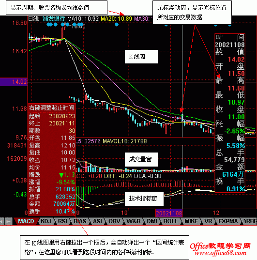 当您看K线图的时候您往往希望知道在某个区域的涨跌幅多大、换手率多少等。在“同花顺”里我们提供了“区间统计”功能,您只用简单地在K线图上您感兴趣的区域用鼠标右键拉出一个框,系统将对这个框所对应时间段里股票的涨跌幅、总成交量、换手率等指标做出统计,让您简单、快捷地分析股票的走势。如上图所示。