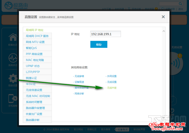 1.用手机或电脑打开极路由后台,点击左侧的【高级设置】图标,然后点击“无线中继”。