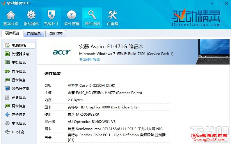3、在硬件预览页面,我们能看到我们电脑的详细配置,任何硬件设施都能检测到。另外还有详细信息和温度监控给大家更好地了解自己的软件。