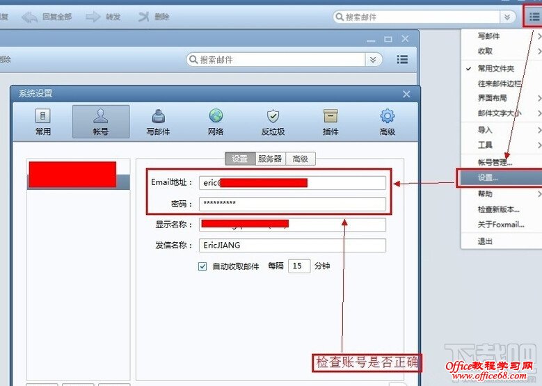 2、检查POP3和SMTP、端口、账户是否正确。注:有些邮箱的账号是邮箱地址。有些邮件只要@前面的。