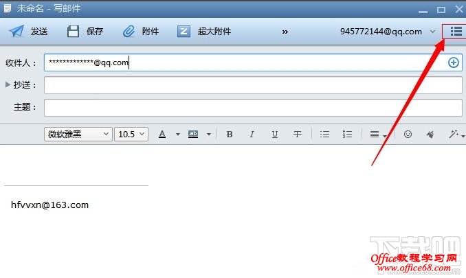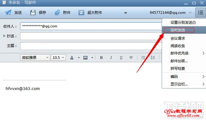 2、在弹出的写邮件窗口的左上角找到如图所示的小方格!并点击,在下拉菜单中,有个“定时发送”按钮,点击进去。