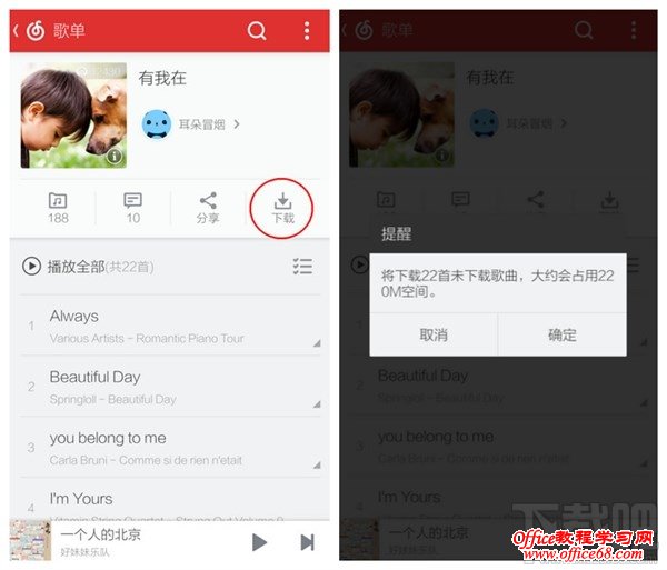 作为一款手机音乐软件,网易云音乐肯定是有歌曲下载功能的,只能在线听的话岂不是都离不开为WiFi了,所以下载到本机才是王道。下面跟下载吧小编一起来看看网易云音乐怎么下歌。 网易云音乐下载歌曲方法一、歌单下载 在歌单页面就有个大大的【下载按钮】,点击之后后会提示是否下载歌单中的全部歌曲。