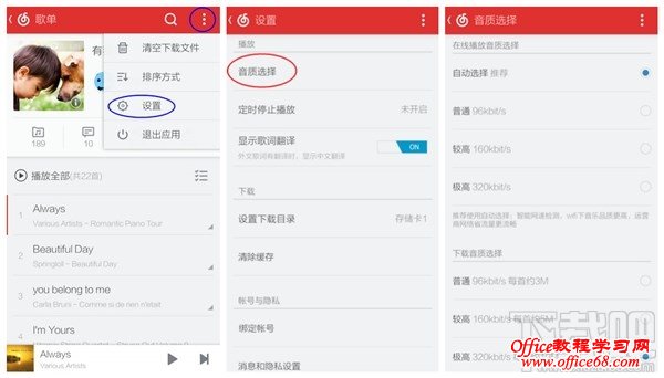 另外,前面说了,网易云音乐提供高品质的在线播放和下载,如果想在下载时自动下载高品质的,那么在网易云音乐的一级和二级页面的右上角的设置里便可以找到音质选择的设置。