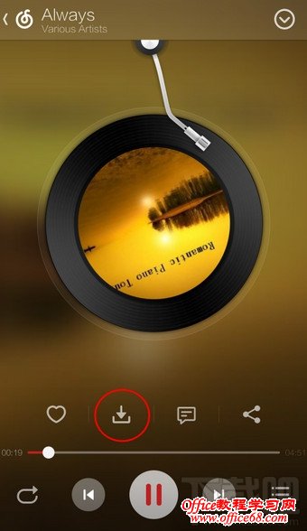 四、试听下载 如果不着急,小伙伴们都会选择先试听一下,看是否对自己口味再决定下载。那么选择播放后,在播放界面,如果觉得好听,就可以点击“唱片”下四个选项中的第二个“下载”按钮啦!