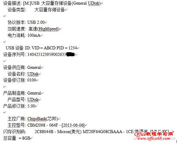 从随机读写速度,文件复制速度等测试项目看128GU盘与Kingston U盘的指标有相当差距,虽然写入速度慢,毕竟价格便宜,作为备份存储用还是可以接受的,此时又在网上发现同样的128GU盘 只要25元,笔者准备再购两只做备份存储,为谨慎起见,用U盘芯片检测工具芯片精灵ChipGeniusV4.00 对128GU盘做了检测,结果如下: