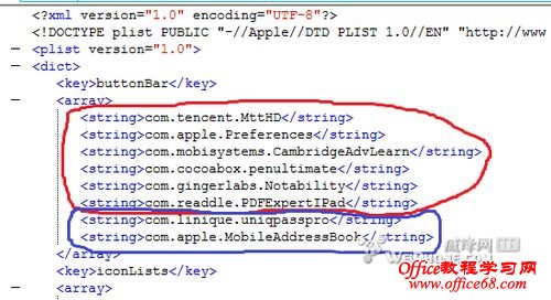 然后分别把这两行字剪切,分别粘贴到那六个Dock栏程序的下边,如图显示,红圈是本身Dock程序,蓝圈是想要隐藏的程序,记得把剪切后留下的空行删掉。