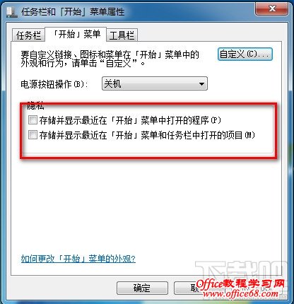 2:“开始菜单”,下面隐私。这里很多人都没有怎么注意到的地方。去掉勾勾,点击应用再确定。