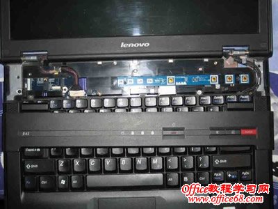 第三,开关挡板拿下来之后,下面就是开关电路板和键盘上侧的螺丝固定的地方,键盘上面有两颗螺丝,拧下来就能将键盘松开了。但是要记住笔记本键盘下面还有排线,一定不能弄断了。