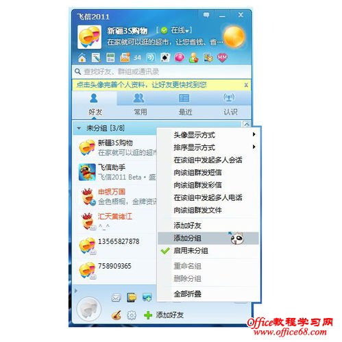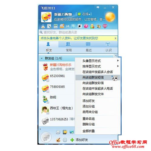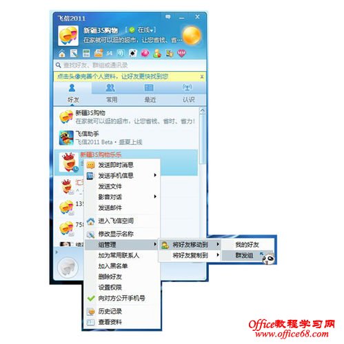 第四,右键点击需要群发的好友,依次选择组管理--将好友移动到--群发组,左键单击。即可将该好友移动到群发组内。