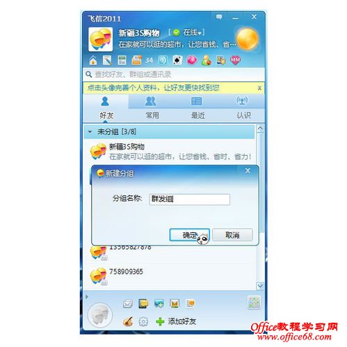 第三,输入新建群组的名称,本示例起名群发组,名称可自己随意起。点击确定按钮。