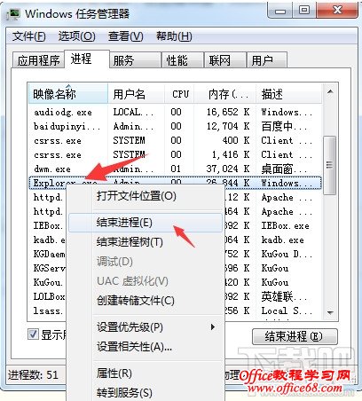 方法二: 1:打开任务管理器,找到【explorer.exe】进程,右键点击选择结束改进程。