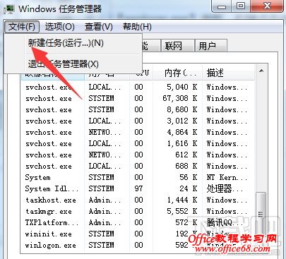 2:进程结束之后,点击任务管理器上方的【文件】选项。在下拉菜单中点击【新建任务】