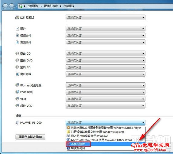 在【设备】处找到我们的手机,在右边选择【不执行操作】,然后点击【保存】