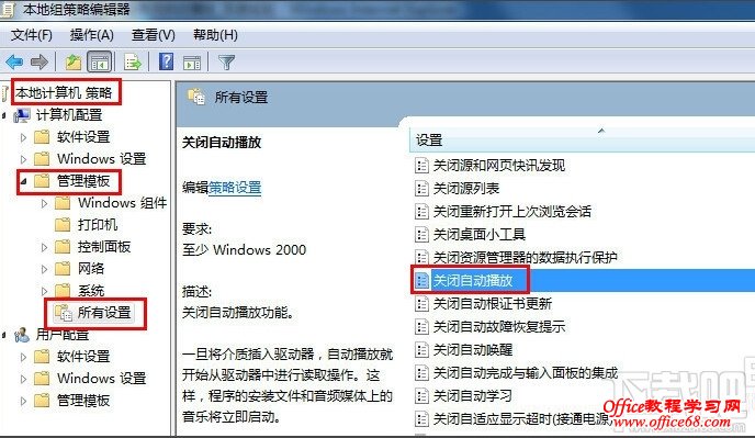 【本地计算机策略】→【计算机配置】→【管理模板】→【所有设置】,在【所有设置】里面找到【关闭自动播放】