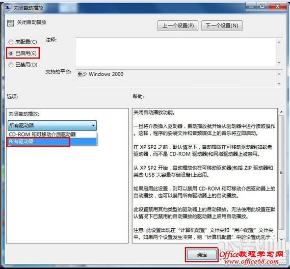 双击打开【关闭自动播放】,在右上角选择【已启用】,在【选项】里面,选择【所有驱动器】,点击【应用】和【保存】就可以