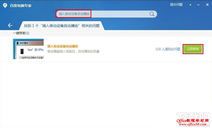 如何关闭“自动播放”窗口。有时我们把手机的数据线插在电脑的USB接口上用来充电,但是每次都会弹出自动播放,非常的不方便,这是怎么回事呢?能不能把自动播放这窗口给禁用了呢?下文就让小编跟大家讲讲关闭移动设备时跳出的“自动播放窗口”。 关闭“自动播放”窗口方法:方法一: 下载百度电脑专家,在搜索框内输入“插入移动设备自动播放”,在搜索结果里面选择【立即修复】,修复完成后重新插拔数据线自动播放不会再弹出: