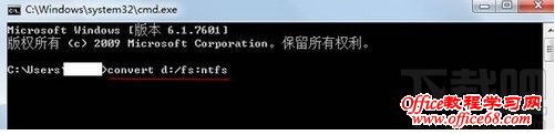 在命令提示符中输入转换指令:convert *:/fs:ntfs,按下回车即可,*代表你要转换的盘符。比如d盘就是convert d:/fs:ntfs,以此类推