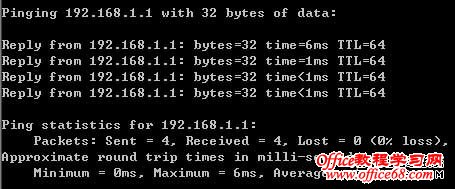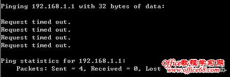 输入命令:Ping 192.168.1.1,回车。 如果屏幕显示为: