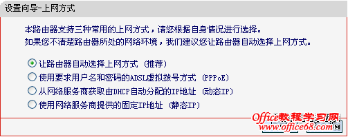 单击“下一步”,进入上网方式选择页面。页面显示了最常用的三种上网方式,您可以根据自身情况进行选择,然后单 击“下一步”。