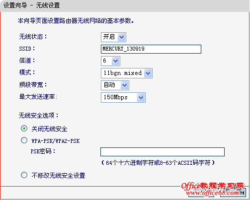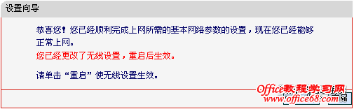 无线状态:开启或者关闭路由器的无线功能 SSID:设置任意一个字符串来标识无线网络 信道:设置路由器的无线信号频段,推荐选择自动 关闭无线安全:关闭无线安全功能,即不对路由器的无线网络进行加密,此时其他人均可以加入该无线网络。 WPA-PSK/WPA2-PSK:路由器无线网络的加密方式,如果选择了该项,请在PSK 密码中输入密码,密码要求为8-63 个ASCII 字符或8-64 个16 进制字符。 不修改无线安全设置:选择该项,则无线安全选项中将保持上次设置的参数。如果从未更改过无线安全设置,则选择该项后,将保持出厂默认设置关闭无线安全。 单击“下一步”后,会出现设置向导完成界面。点击“重启”后即可完成路由器设置。
