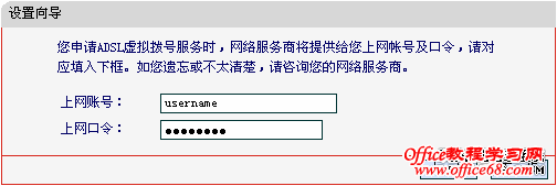 a.让路由器自动选择上网方式(推荐) 这里示例中演示的是一般家庭宽带用户所采用的PPPoE的上网方式,点击“下一步”后出现如下画面。填写ISP给我们提供的宽带用户名和密码。