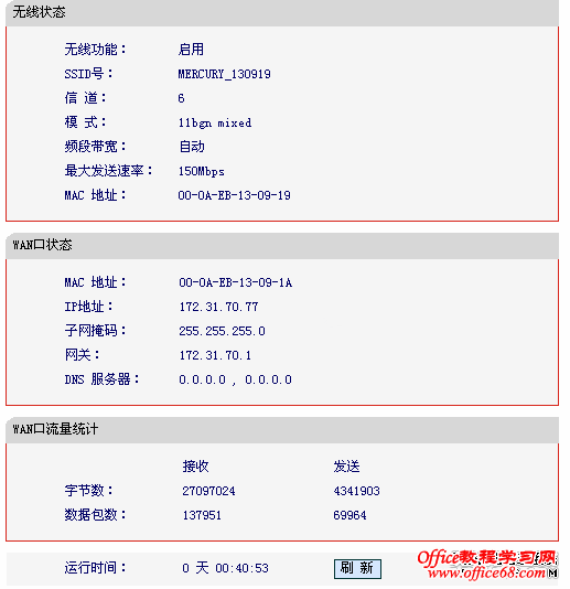 查看WAN口状态,如果IP地址显示为非“0.0.0.0”说明我们的路由器已经连接互联网,WAN口流量显示当前路由器接收、发送的数据包数量。到这里我们的路由器设置就完成了 |