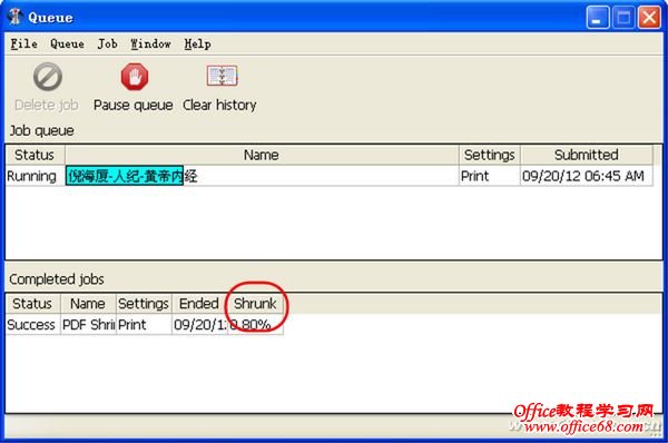 接下来点击Process PDF按钮或将需要瘦身的PDF文件直接拖放到主界面的对应项目,瘦身工作自动开始。窗口中Status显示当前的工作状态,Name下面的空白处显示的是压缩的进度,Settings则表示所选择的压缩模式(Print 打印)。结束之后,下栏会显示出减肥的比率Shunk(图7)。
