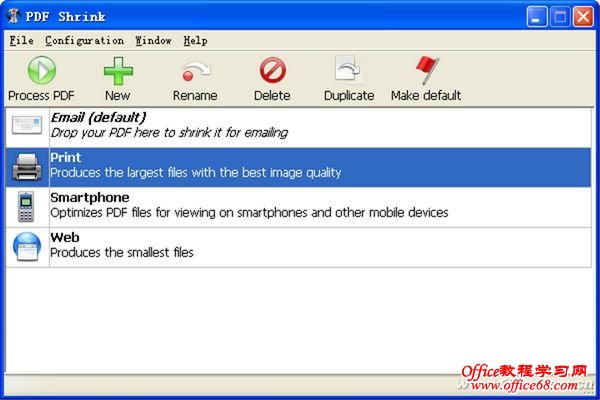 如果我们手头上的PDF电子书不是图片扫描版的,那么就应该考虑下面这种方案了。这是一种解决图文版PDF减肥的方案。网上一些给PDF减肥的软件一般多是针对图文混排版PDF而设计的。下面,我们通过专用减肥软件PDF Shrink实现对一本图书的减肥。 启动PDF Shrink后,在软件给出的4种方案中根据实际需求进行选择。采用Email方式压缩后方便作为邮件发送,压缩率为1:10;用Print方式压缩后可用于打印,原文件依然保持较好的清晰度,压缩率为1:2;Smartphone方式则表示可用于手机或移动设备上阅读;Web方式主要用于网页中查看,压缩率最大,为1:13左右。具体选择哪一种要根据所用场合进行(图6)。比如,我要优化的这本书需要打印出来看,所以这里我选择使用“Print(打印模式)”进行压缩减肥。