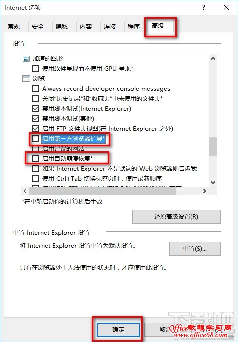 切换到“高级”选项卡,在“设置”窗格中向下滚动设置项,找到“浏览”区域的“启用第三方浏览器扩展”以及“启用自动崩溃恢复”选项,取消勾选,确定关闭窗口,重启电脑。