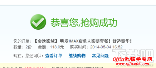 8、成功支付后,网页会自动跳转回糯米网的页面,显示“恭喜您抢购成功”.